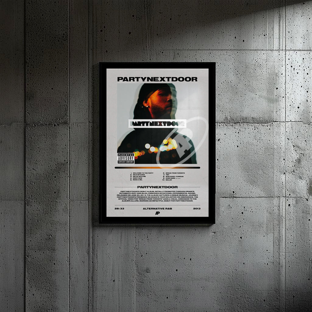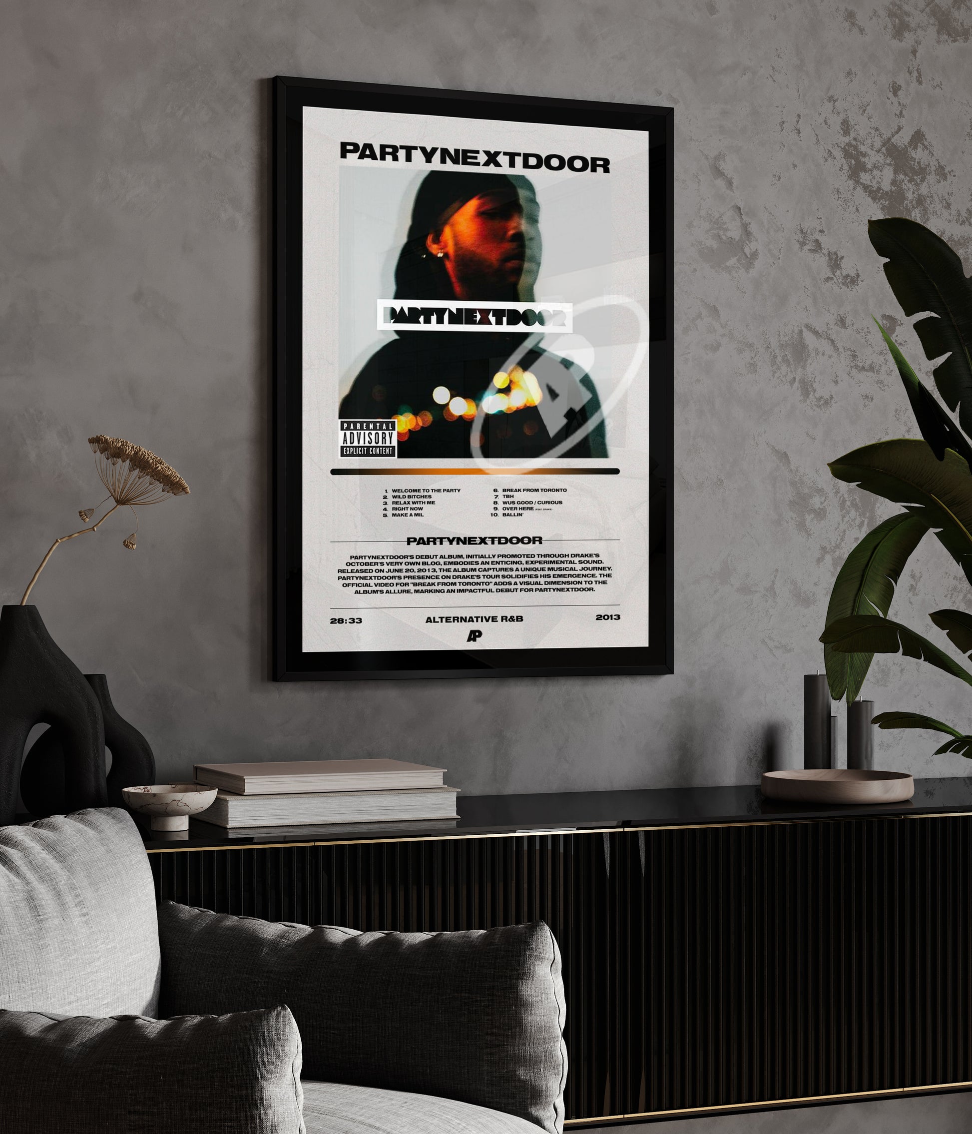 A unique artwork homage honouring PARTYNEXTDOOR's 2013 album "PARTYNEXTDOOR", translating it into an exquisite piece of decor to elevate your space, and showcase your music taste.
