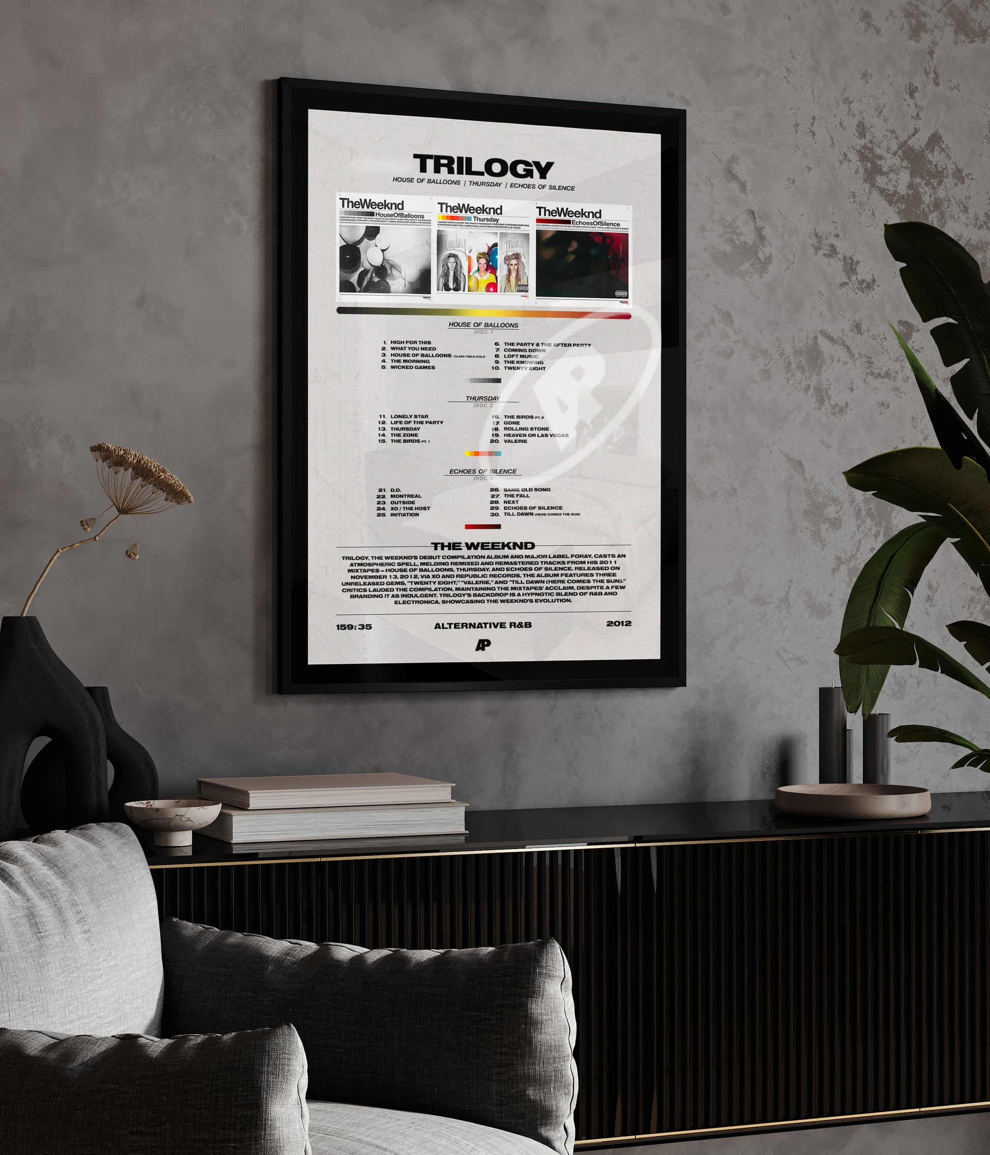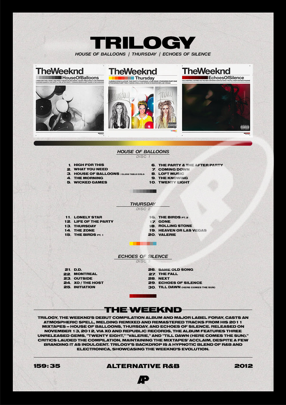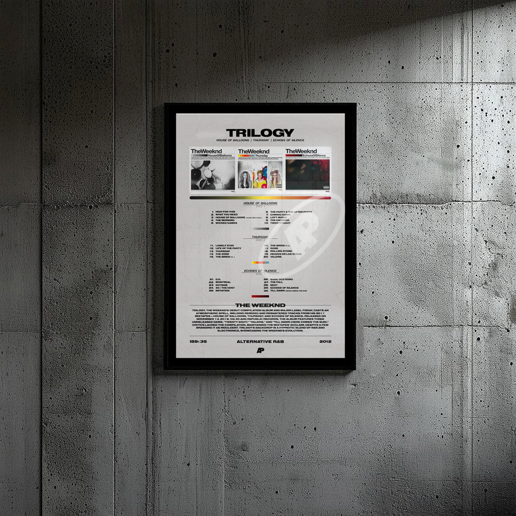 A unique artwork homage honouring The Weeknd's 2012 album "Trilogy", containing 'House of Balloons', 'Thursday', and 'Echoes of Silence', translating it into an exquisite piece of decor to elevate your space, and showcase your music taste.